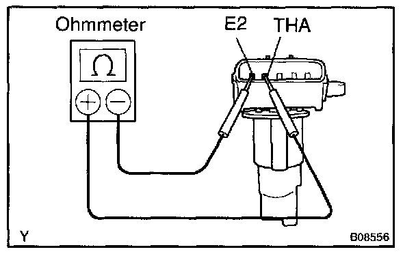 Using an ohmmeter, measure the resistance between terminals THA and E2.