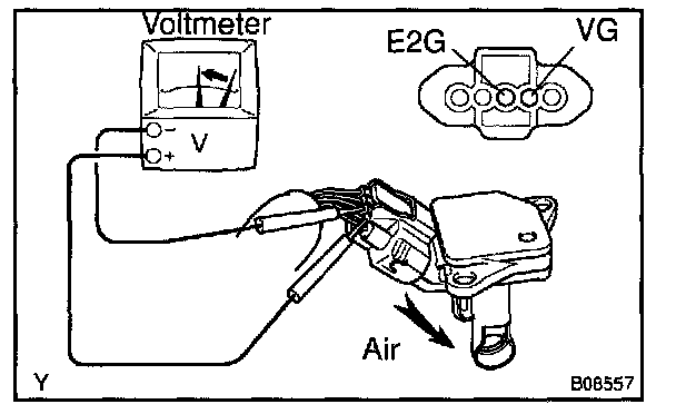 d. Blow air into the air flow meter, and check that the voltage fluctuates.