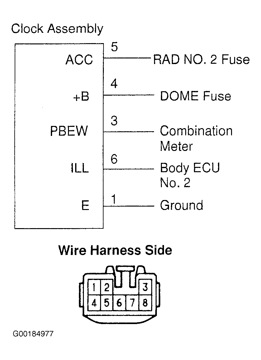 - Check that the battery positive voltage is 10-16 volts. If the voltage is not as specified, replace the battery. Check that the DOME and RAD NO. 2 fuses are not blown. See Fig 1. If the fuse is blown, replace the fuse and check for a short. Inspect the connector on the wiring harness side. Trouble shoot the clock as follows:
