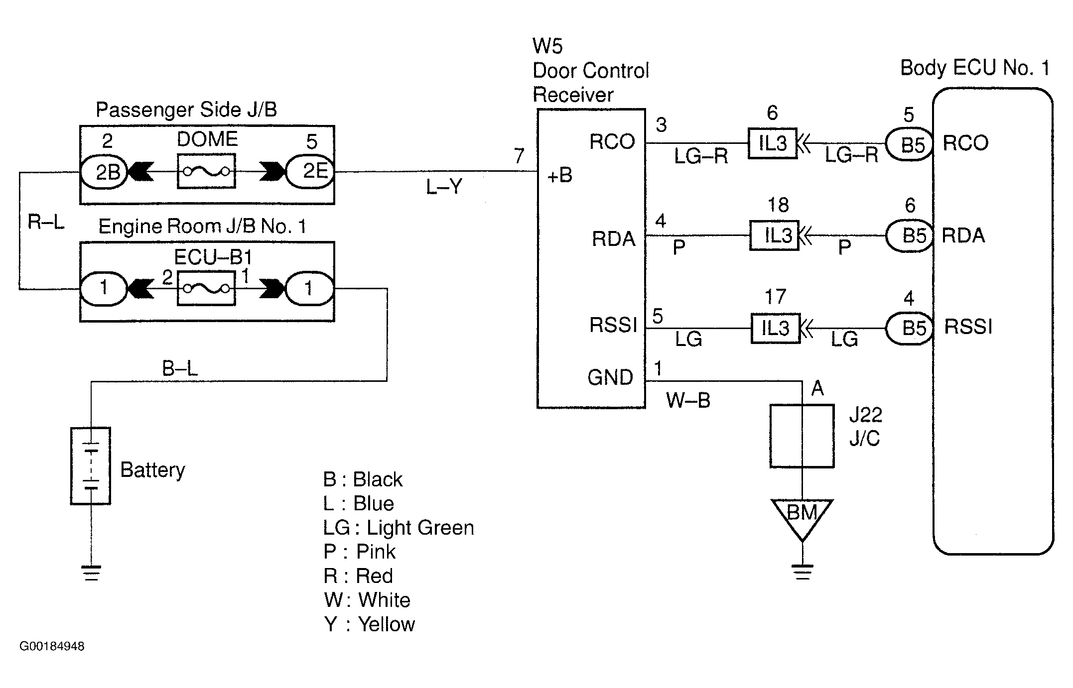 - Check the wiring harness. Disconnect the connectors of the wireless door lock tuner and B5 of the body ECU No. 1. Check the continuity between terminals RCO of the wireless door lock tuner and RCO of the body ECU No. 1. If there is continuity, go to the next step. If there is not continuity, repair or replace the wiring harness.