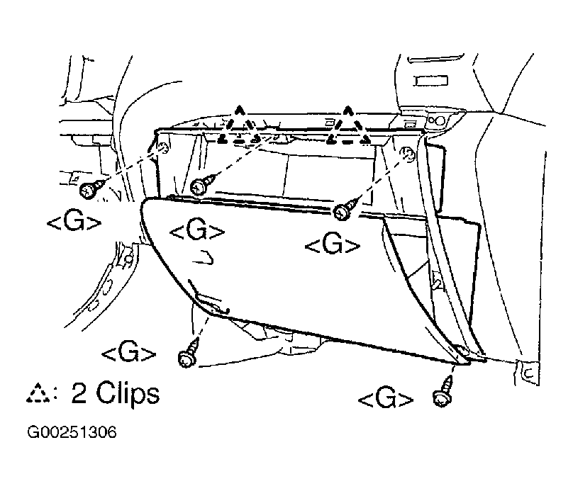 - Remove 5 screws, disengage 2 clips and remove glove compartment door assembly. See Fig 3.