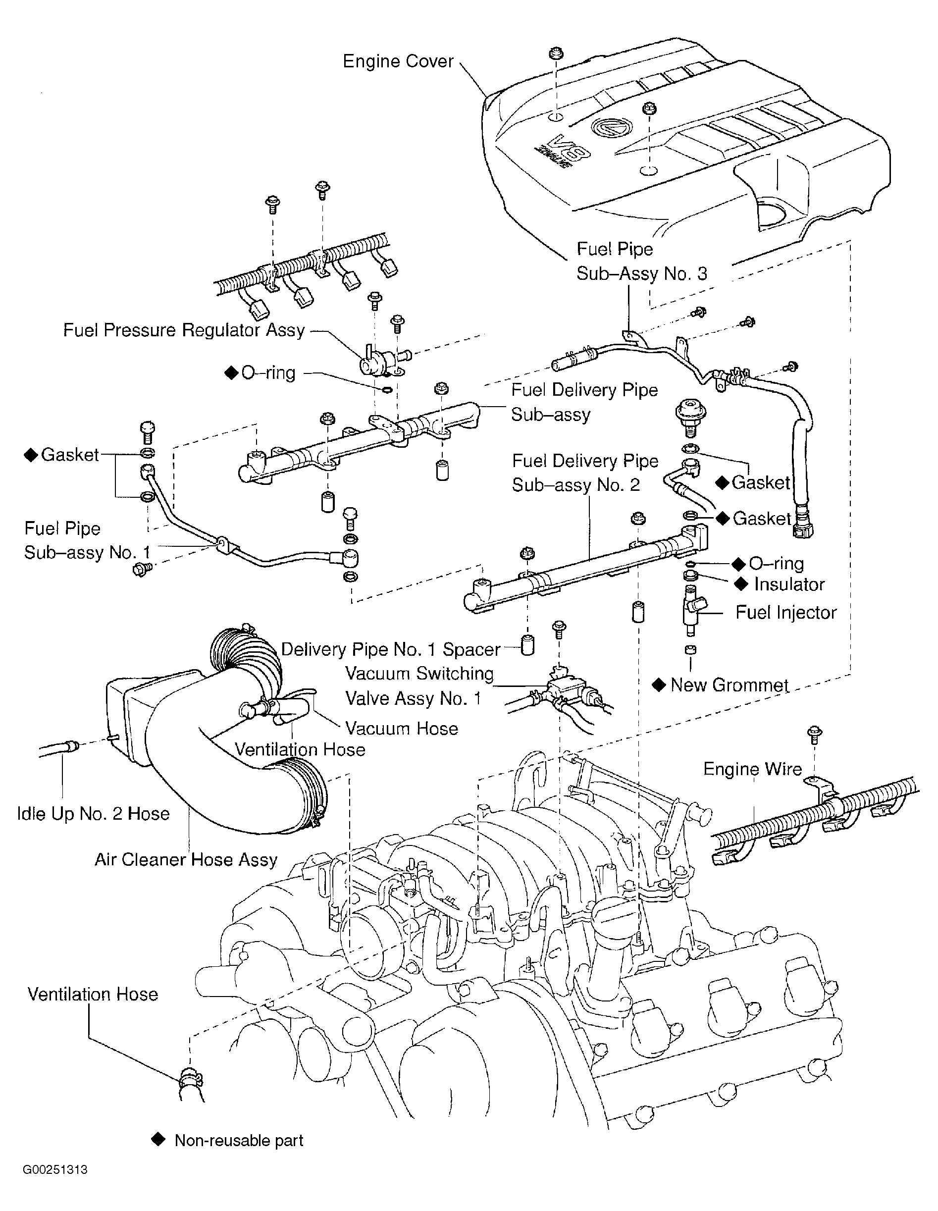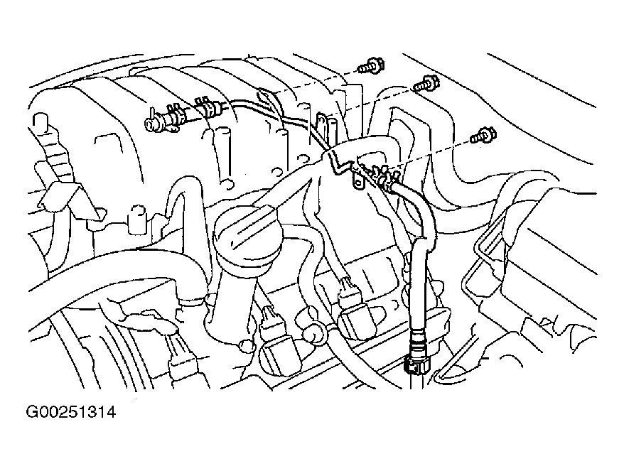 - Disconnect 8 fuel injector connectors. Remove 3 bolts and disconnect engine wire.