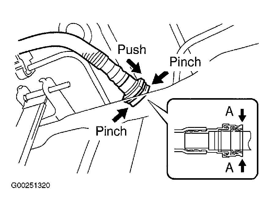 - Disconnect fuel tank breather tube from fuel tank by pushing connector deep inside, pinch part "A" and pull out connector. See Fig 5.