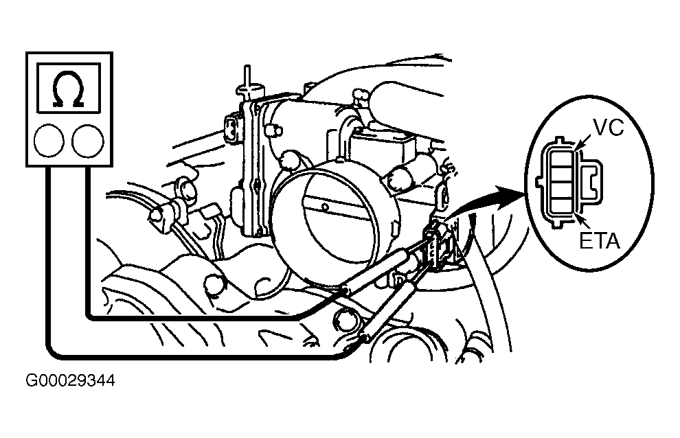 Disconnect Throttle Position (TP) sensor 4-pin connector. See Fig 1. Measure resistance between terminals VC and ETA at TP sensor. Resistance should be 1250-2350 ohms at 68°F (20°C). If resistance is not 1250-2350 ohms, replace TP sensor.