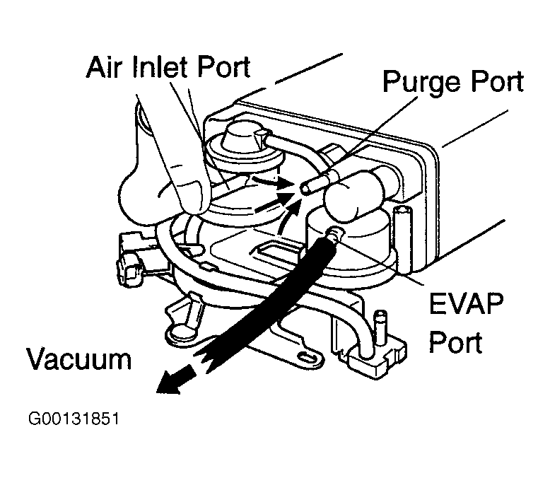 - While holding air inlet port closed, apply 1.01 in. Hg (3.43 kPa) to EVAP port and ensure vacuum air flows into purge port. See Fig 5. If vacuum air does not flow into purge port, replace charcoal canister. If air does flow, go to next step.