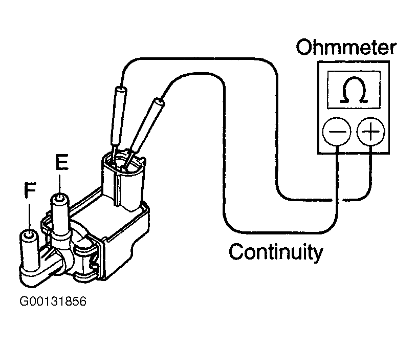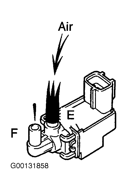 2. Using ohmmeter, ensure there is no continuity between each terminal and VSV body. See Fig 2. If continuity is present, replace VSV. If continuity is not present, check that air does not flow between ports "E" to "F". See Fig 3. Apply battery voltage between VSV terminals. Air should flow between ports "E" to "F". See Fig 4.