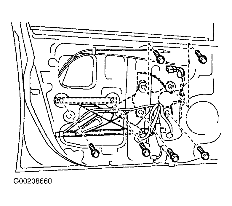 - Remove the window regulator. See Fig 6. Disconnect the connector and disengage the clamps. Remove the 6 bolts and window regulator.