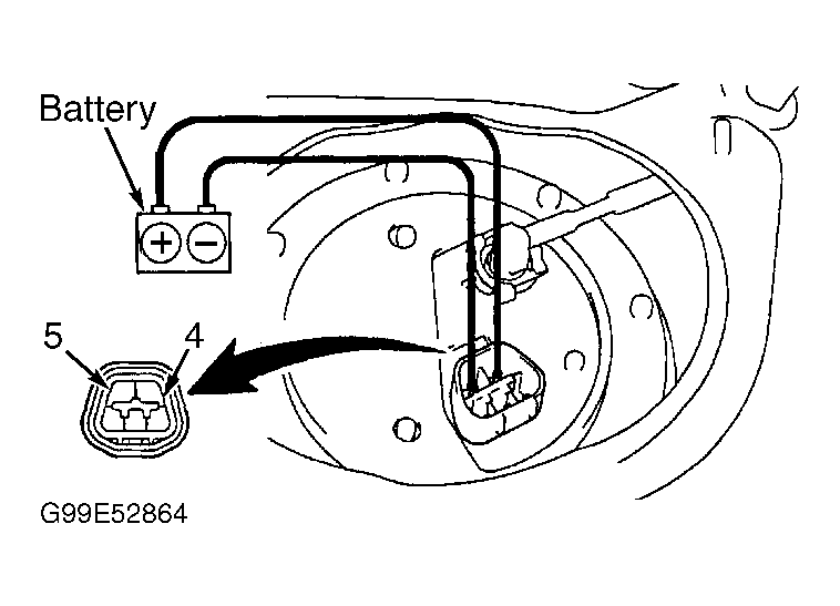 Remove rear seat cushion. Remove floor service hole cover. Disconnect 5-pin connector from fuel pump and sending unit assembly. Measure resistance between terminals No. 4 and 5 at fuel pump and sending unit 5-pin connector. See Figure. Replace fuel pump if resistance is not 0.2-3.0 ohms at 68°F (20°C).
