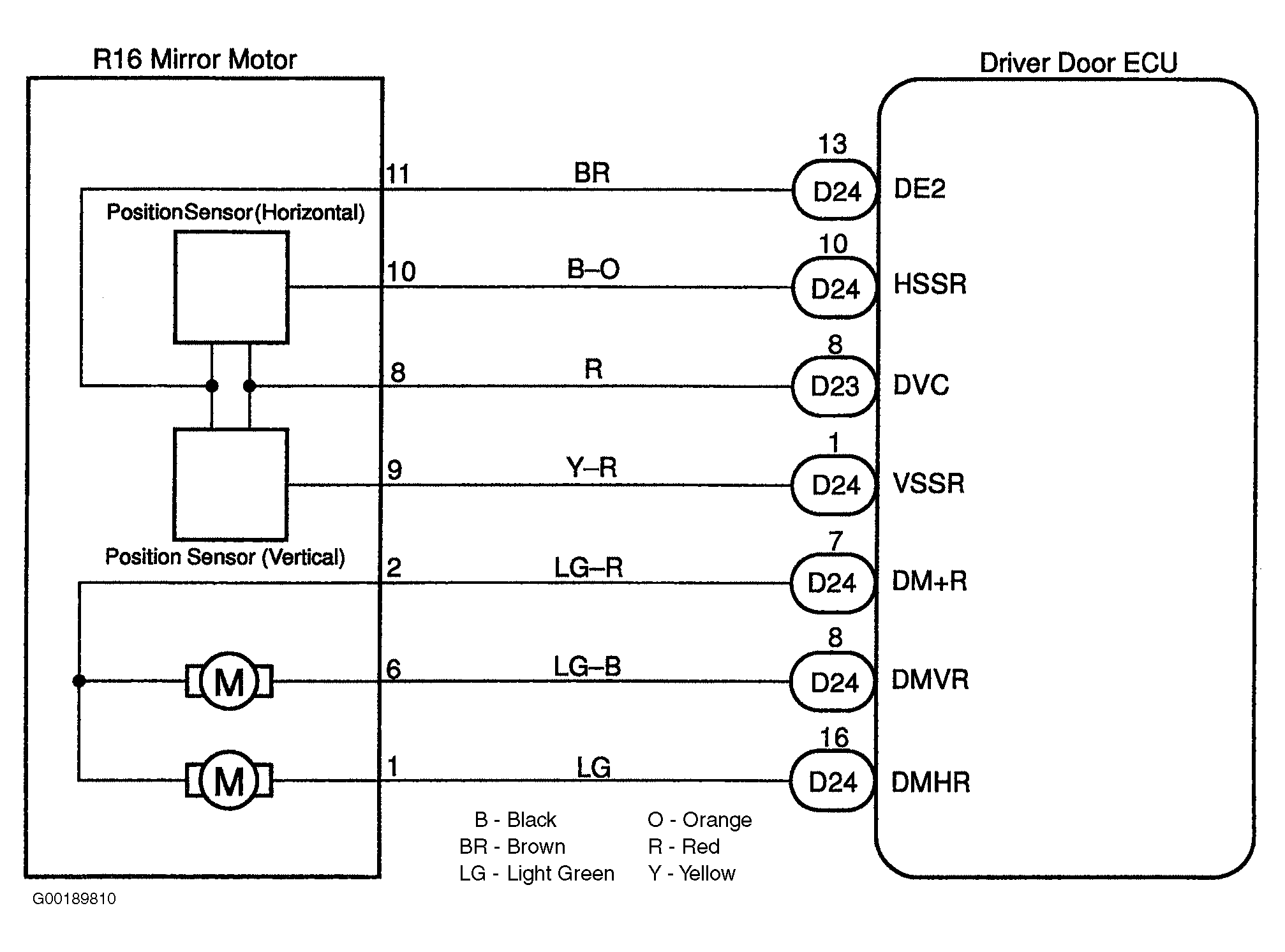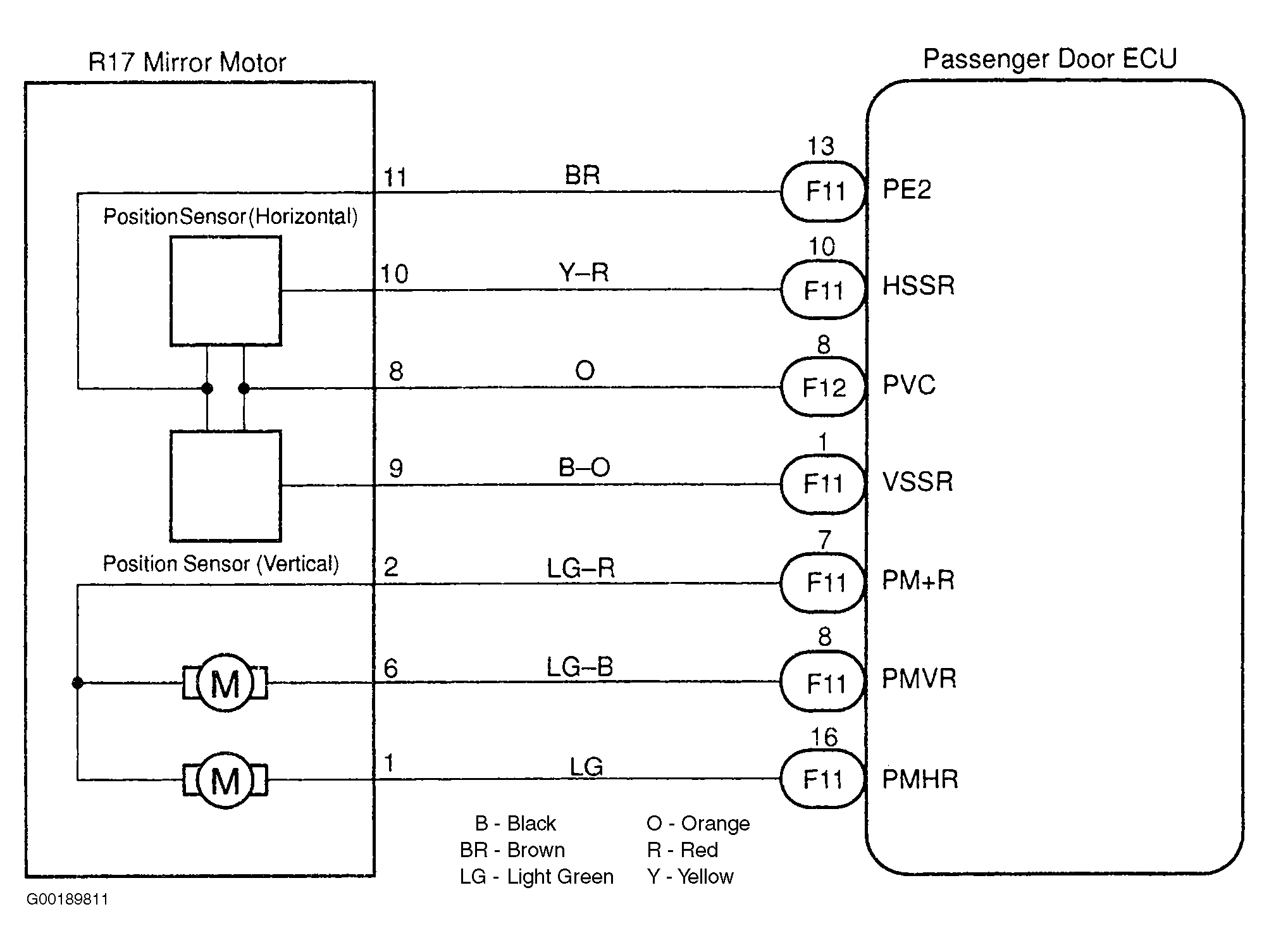 This position is detected by the mirror position sensor and will be memorized in the seat ECU located under the driver seat. This sensor is equipped in the mirror in spite of the existence of the memory function. For the driver door power mirror position sensor circuit, see Figure. For the passenger door power mirror position sensor circuit, see Figure.