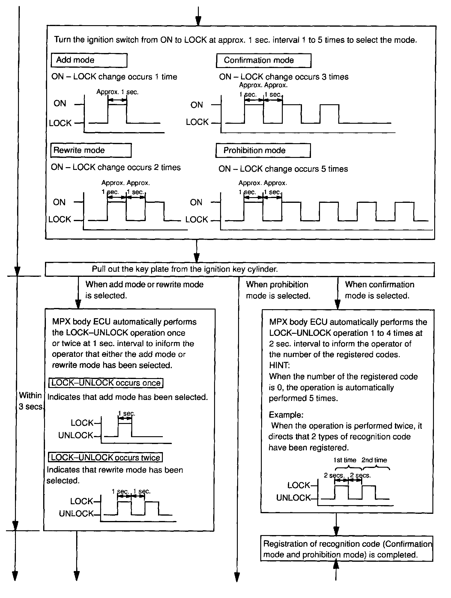 - The add mode is used to retain codes already registered while you register new recognition codes. This mode is used when adding a transmitter. However, if the number of registered codes exceeds 4 codes, previously registered codes are correspondingly erased in order, starting from the first registered code.