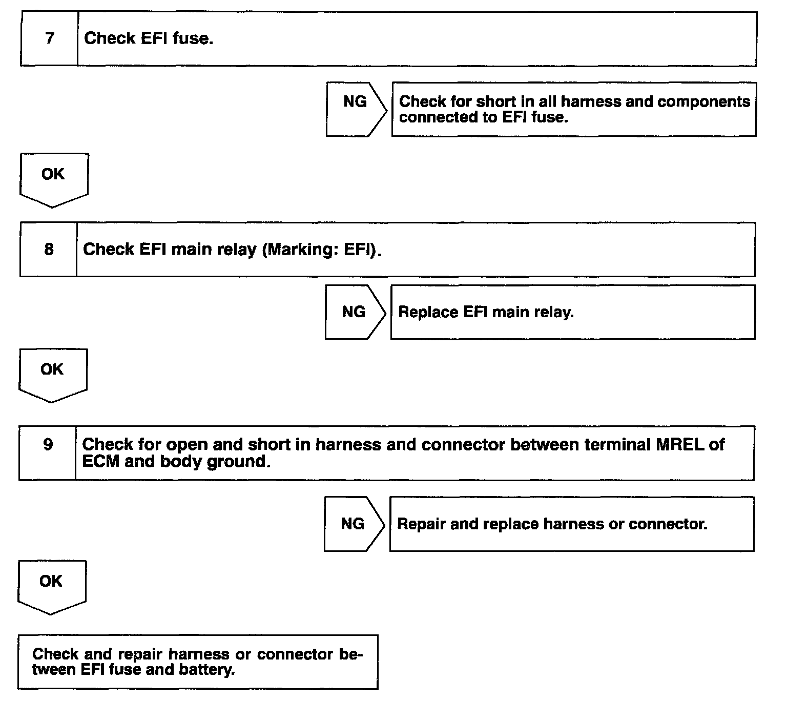 When the ignition switch is turned ON, battery positive voltage is applied to terminal IGSW of the ECM and the EFI main relay (Marking: EFI) control circuit in the ECM sends a signal to terminal MREL of the ECM, switching on the EFI main relay.