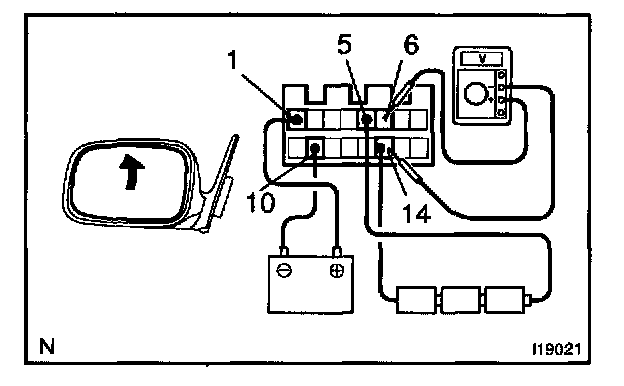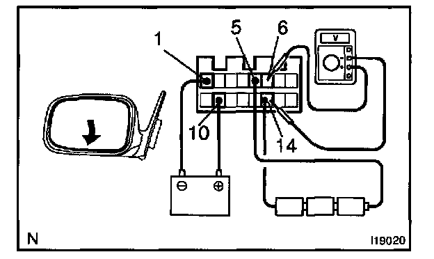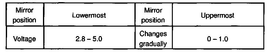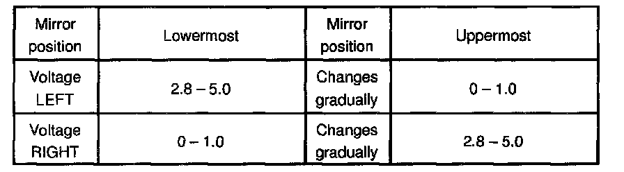 d. Apply battery positive voltage to terminals 1 and 10, then check that the voltage gradually changes according to the table below while the mirror moves between the uppermost position and lowermost position.