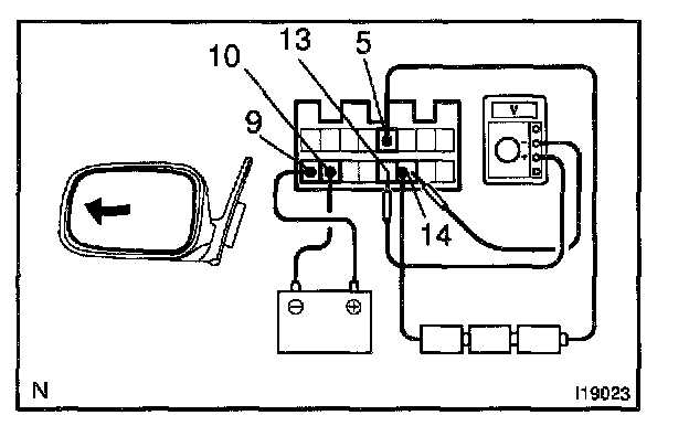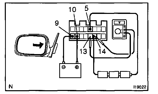 g. Apply battery positive voltage to terminals 9 and 10, then the table below while the mirror moves between the left most position and right-most position.