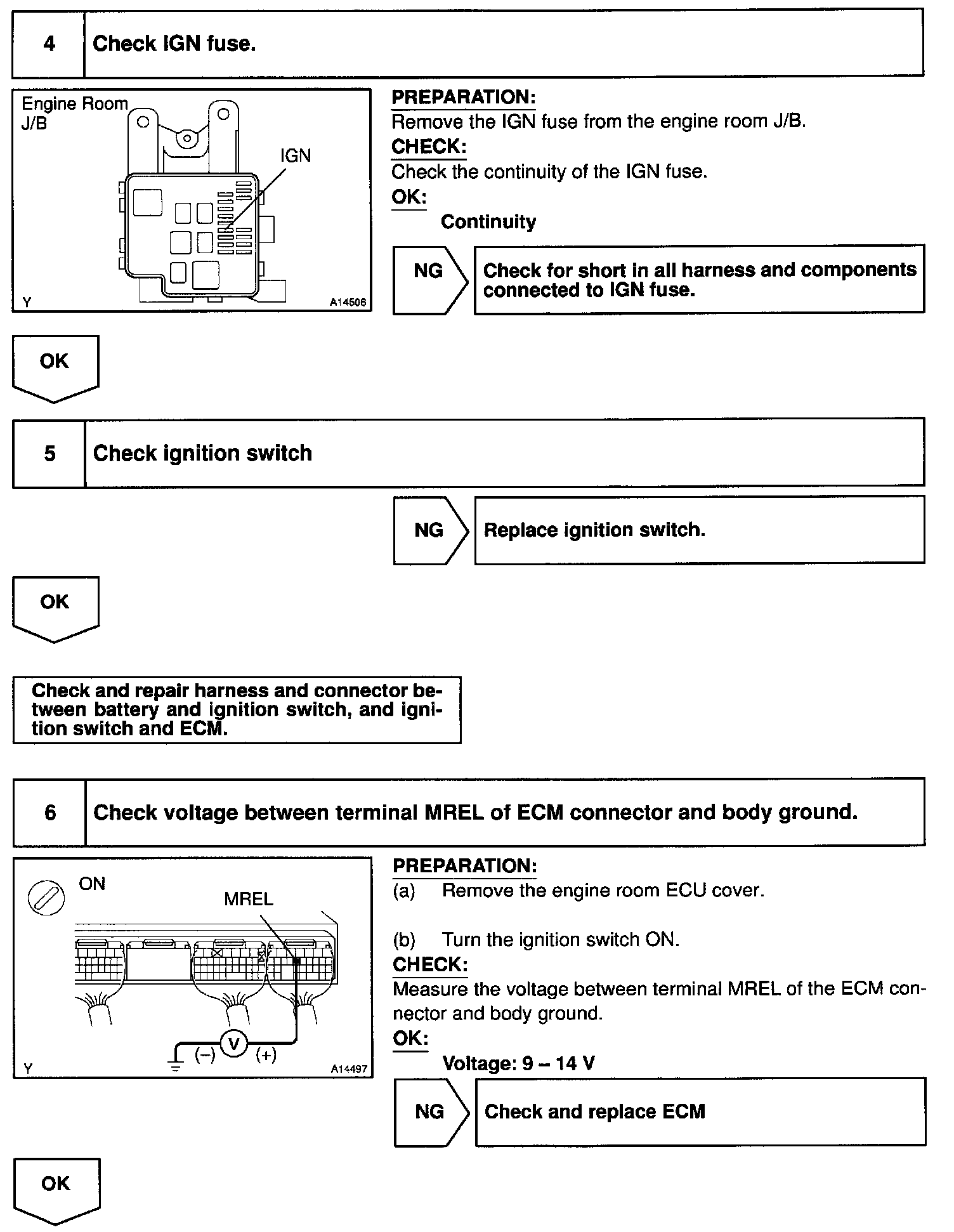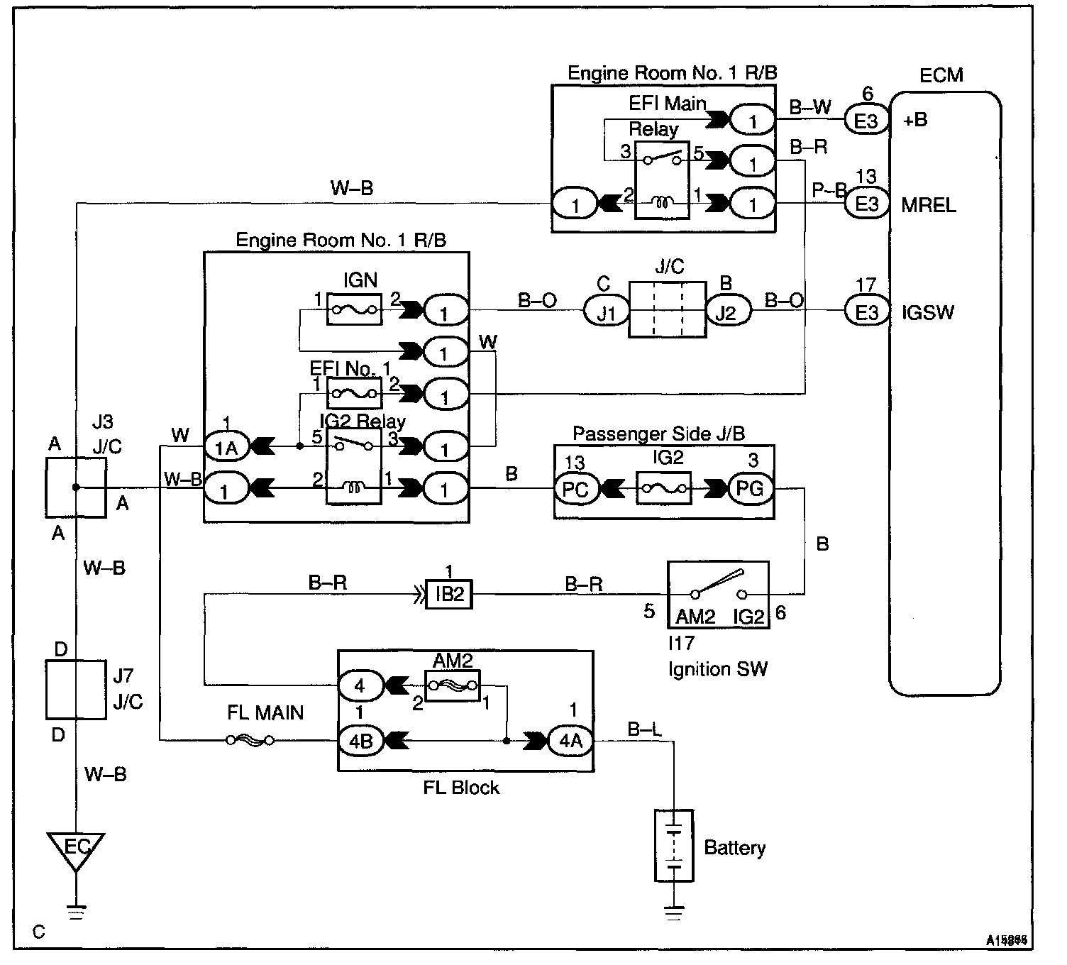 This signal causes current to flow to the coil, closing the contacts of the EFI main relay and supplying power to terminal +B of the ECM