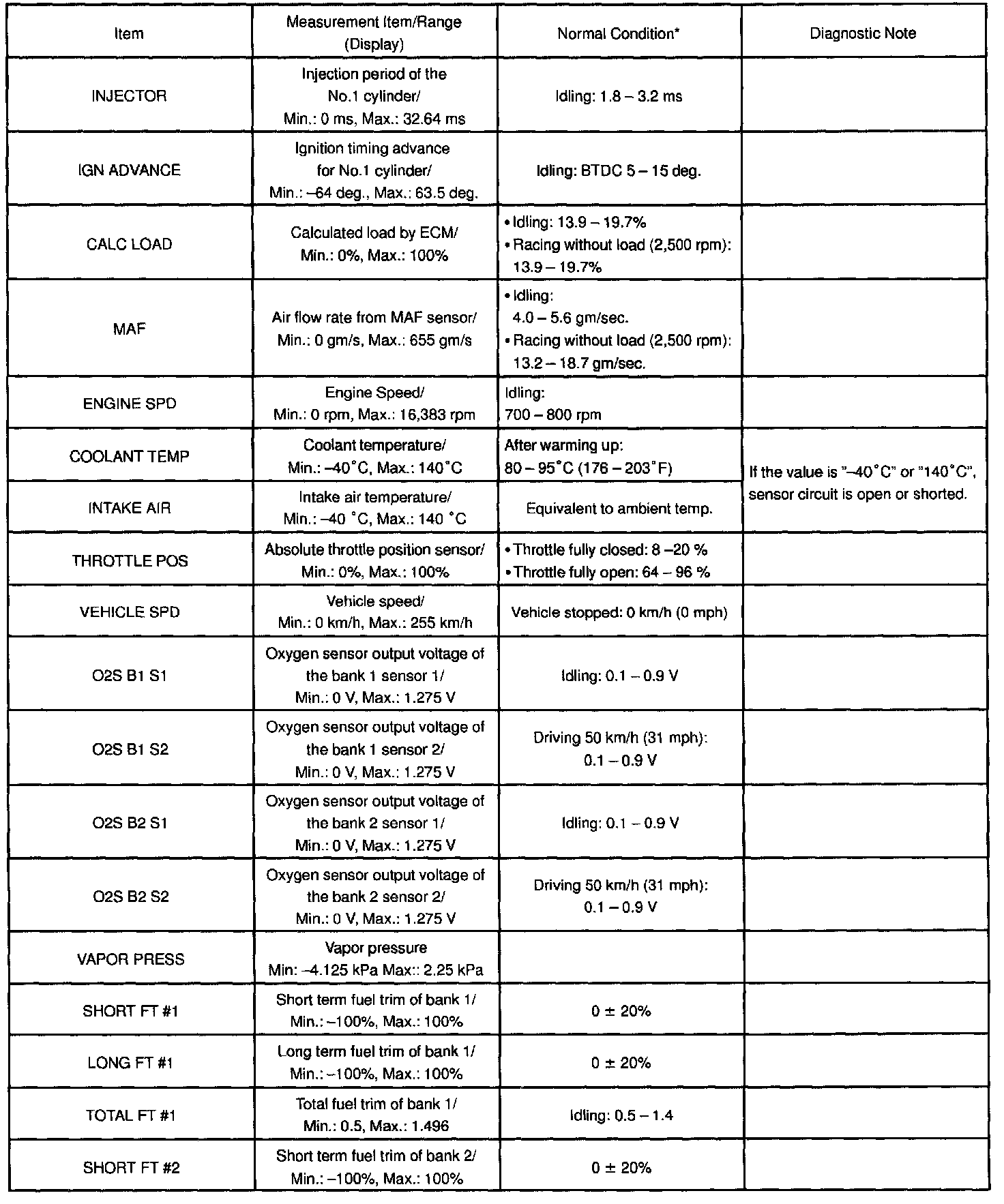 DATA LISTNOTE: The values given below for "Normal Condition" are representative values. So, a vehicle may still be normal even if its value differs from those listed here. So, do not solely depend on the "Normal Condition" here when deciding whether a part is faulty or not.
