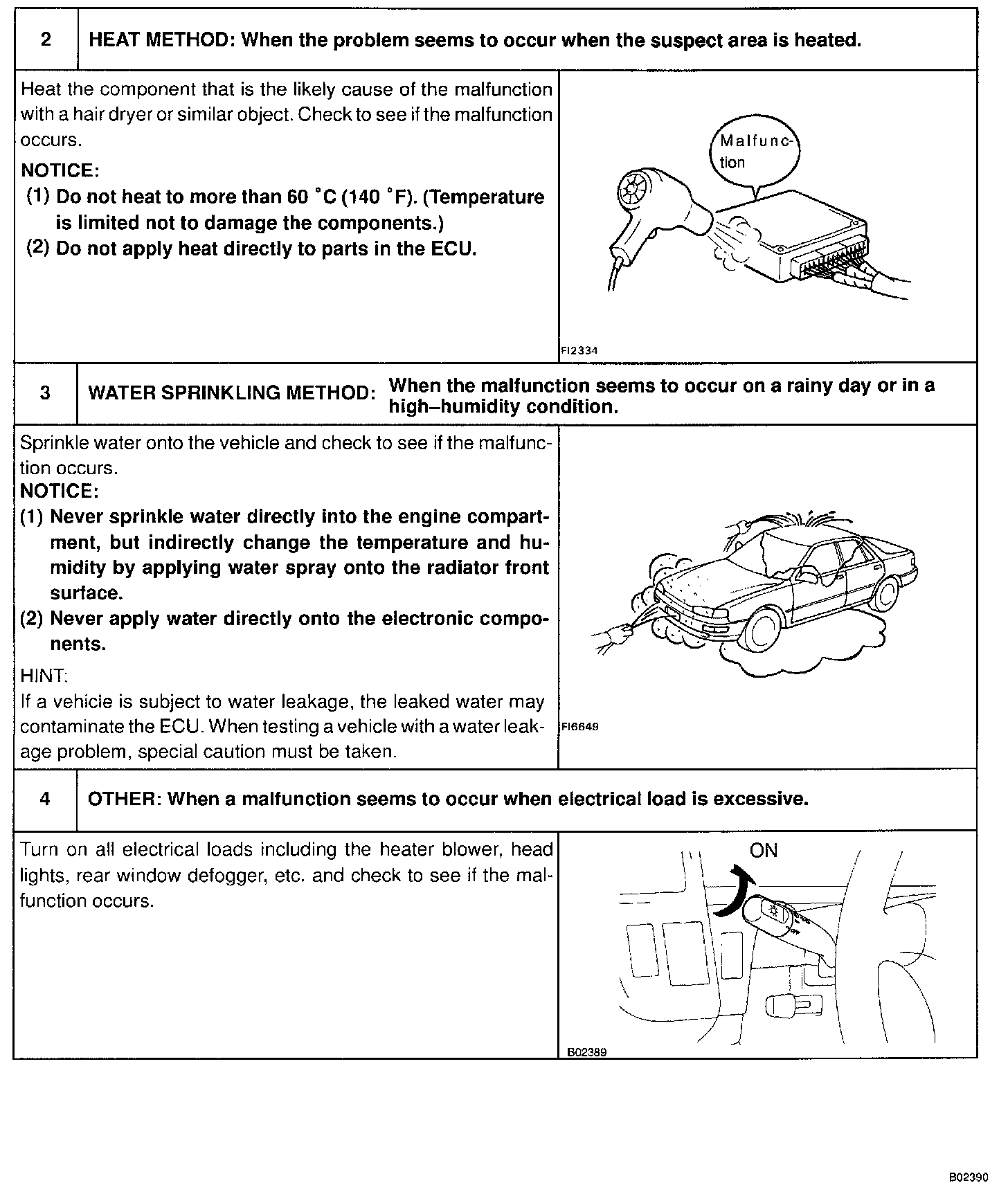 SYMPTOM SIMULATIONThe most difficult case in troubleshooting is when there are no problem symptoms occurring. In such cases, a thorough customer problem analysis must be carried out, then simulate the same or similar conditions and environment in which the problem occurred in the customer's vehicle. No matter how much experience a technician has, or how skilled he may be if he proceeds to troubleshoot without confirming the problem symptoms he will tend to overlook something important in the repair operation and make a wrong guess somewhere, which will only lead to a standstill. For example, for a problem which only occurs when the engine is cold, or for a problem which occurs due to vibration caused by the road during driving, etc., the problem can never be determined so long as the symptoms are confirmed with the engine hot condition or the vehicle at a standstill. Since vibration, heat or water penetration (moisture) is likely cause for problem which is difficult to reproduce, the symptom simulation tests introduced here are effective measures in that the external causes are applied to the vehicle in a stepped condition.