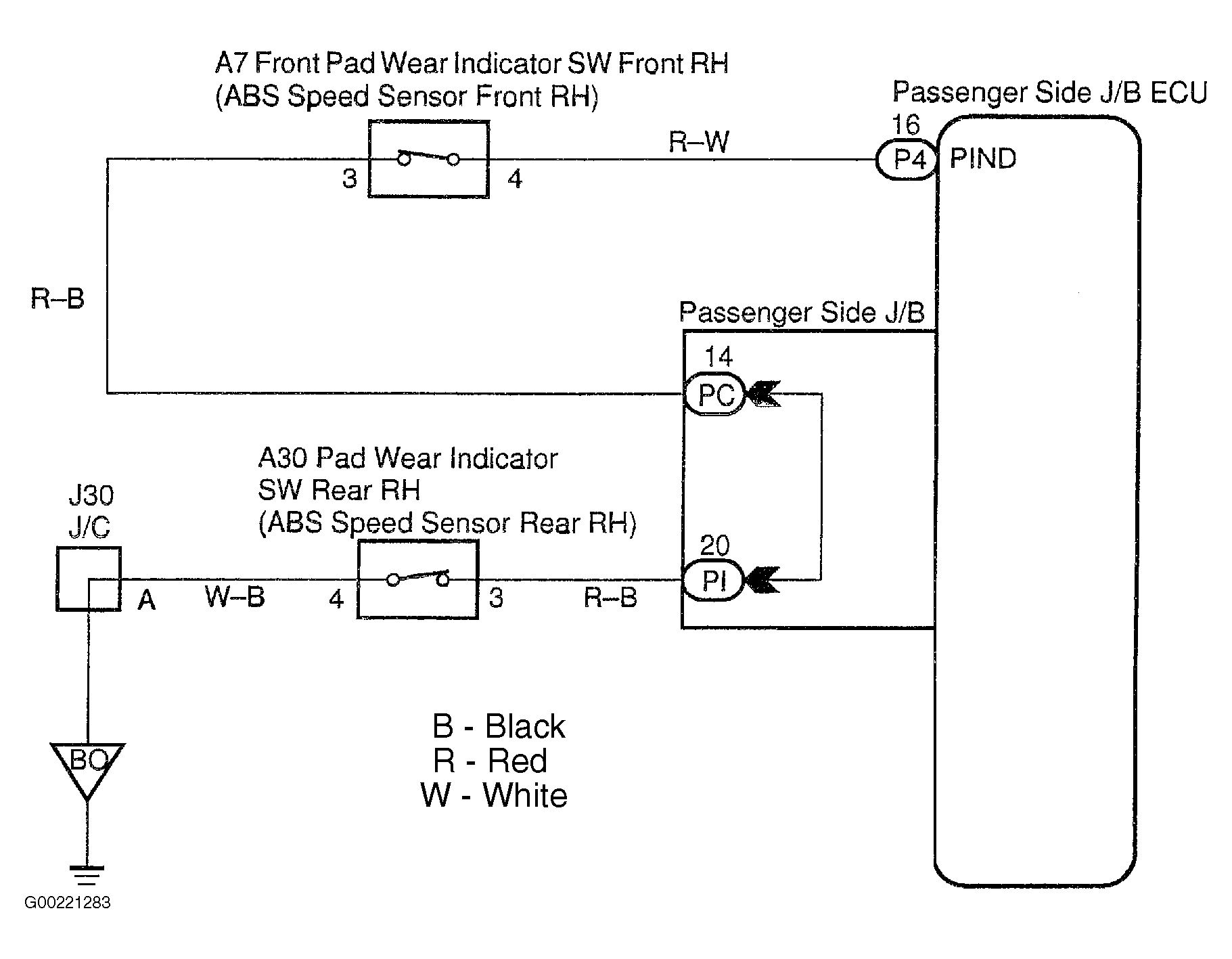 The passenger side junction block (body No. 3) ECU receives the brake pad sensor signal and sends it to the combination meter. For circuit diagram, see Fig 1.