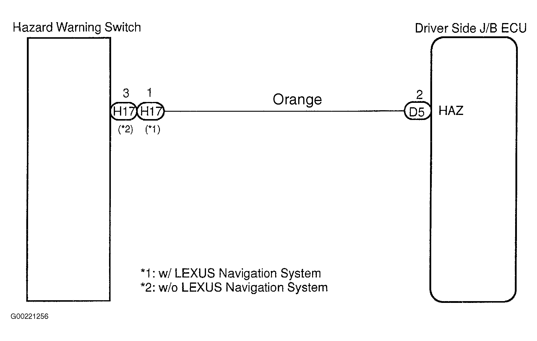 The hazard warning switch sends a signal to the driver side junction block (body No. 2) ECU. See Fig 1.