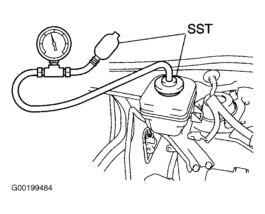 3. Connect the vinyl tube to the bleeder plug of the brake actuator. Using special tool (09992-00242/00350), apply a pressure of 14.2 psi (98.1 kpa) to the reservoir.