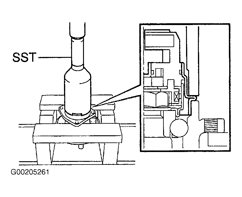 3. Using special tool (09214-76011) and a press, install a new speed sensor to the axle hub. Do not tap the speed sensor with a hammer. Check that there are no foreign objects on the speed sensor detection portion. Press in the speed sensor straight and slowly. See Fig 2.