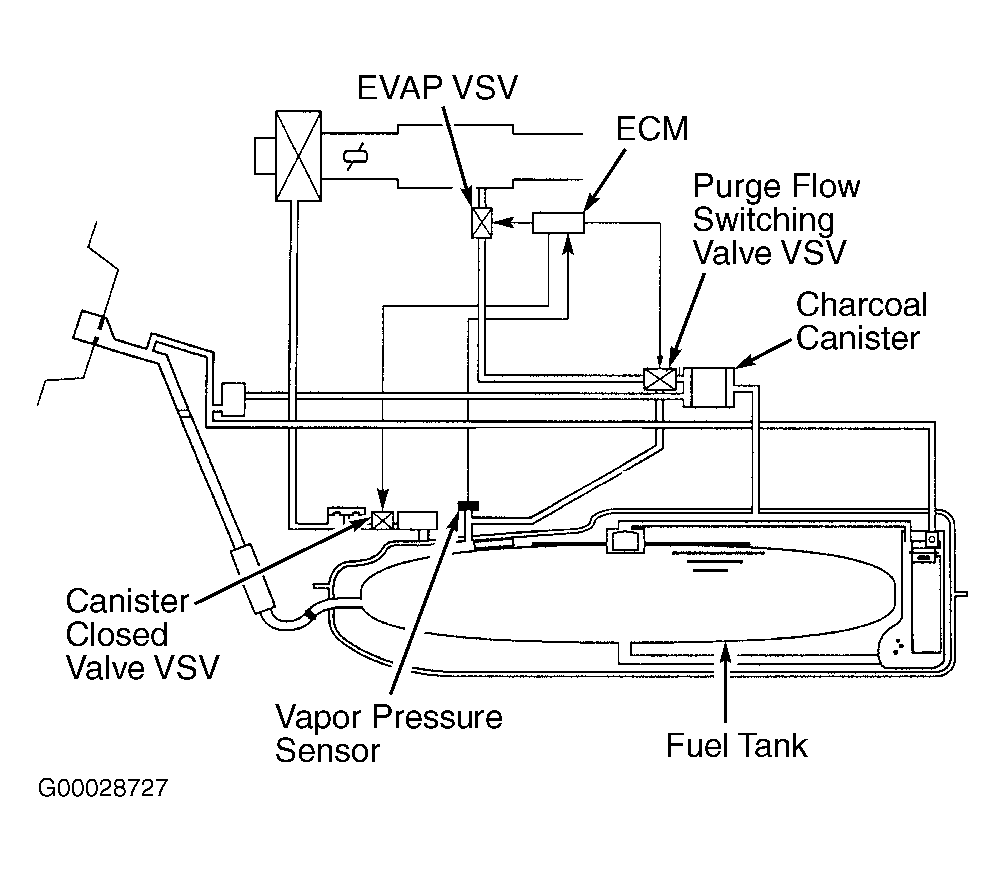 Vapor pressure sensor, purge flow switching valve Vacuum Switching Valve (VSV) and canister closed valve Vacuum Switching Valve (VSV) are used to determine if a leak or an abnormality exists in the EVAP system. See Fig 1. EVAP system may also be referred to as fuel evaporative system. Engine Control Module (ECM) determines if a leak or an abnormality exists in EVAP system by using input signal from vapor pressure sensor. If a leak or abnormality exists, a Diagnostic Trouble Code (DTC) will be stored in the ECM. Vapor pressure sensor may also be referred to as EVAP vapor pressure sensor. Canister closed valve VSV may also be referred to as EVAP Canister Closed Valve Vacuum Switching Valve (EVAP-CCVVSV) or Canister Closed Valve Vacuum Switching Valve (CCV VSV). Purge flow switching valve VSV may also be referred to as EVAP Purge Flow Switching Valve Vacuum Switching Valve (EVAP-PFSVVSV). EVAP canister may also be referred to as charcoal canister.