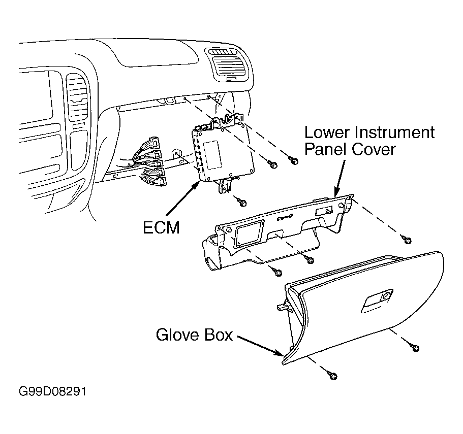Engine Control Module (ECM) is located behind glove box. See Fig 1.
