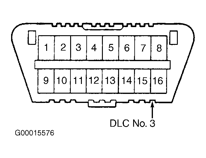 2. Check voltage and resistance between ground and specified terminal on DLC3. See DATA LINK CONNECTOR VOLTAGE & RESISTANCE SPECIFICATIONS  table. See Fig 1. If voltage or resistance are not within specification, check wiring circuit. See ENGINE PERFORMANCE in SYSTEM WIRING DIAGRAMS article in ELECTRICAL. For full wiring diagram of DLC3, it may be necessary to see DATA LINK CONNECTORS article in ELECTRICAL.