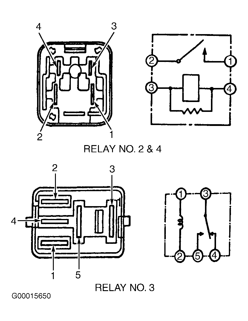 - DRL relays No. 2 and 4 have the same configuration and are tested the same. See Fig 2. Using ohmmeter, check that no continuity exists between terminals No. 1 and 2 of DRL relay. Check that continuity exists between terminals No. 3 and 4 of DRL relay. Using jumper wires, apply battery voltage and ground to terminals No. 3 and 4 of DRL relay. Check that continuity now exists between terminals No. 1 and 2 on DRL relay. Replace DRL relay if continuity is not as specified.