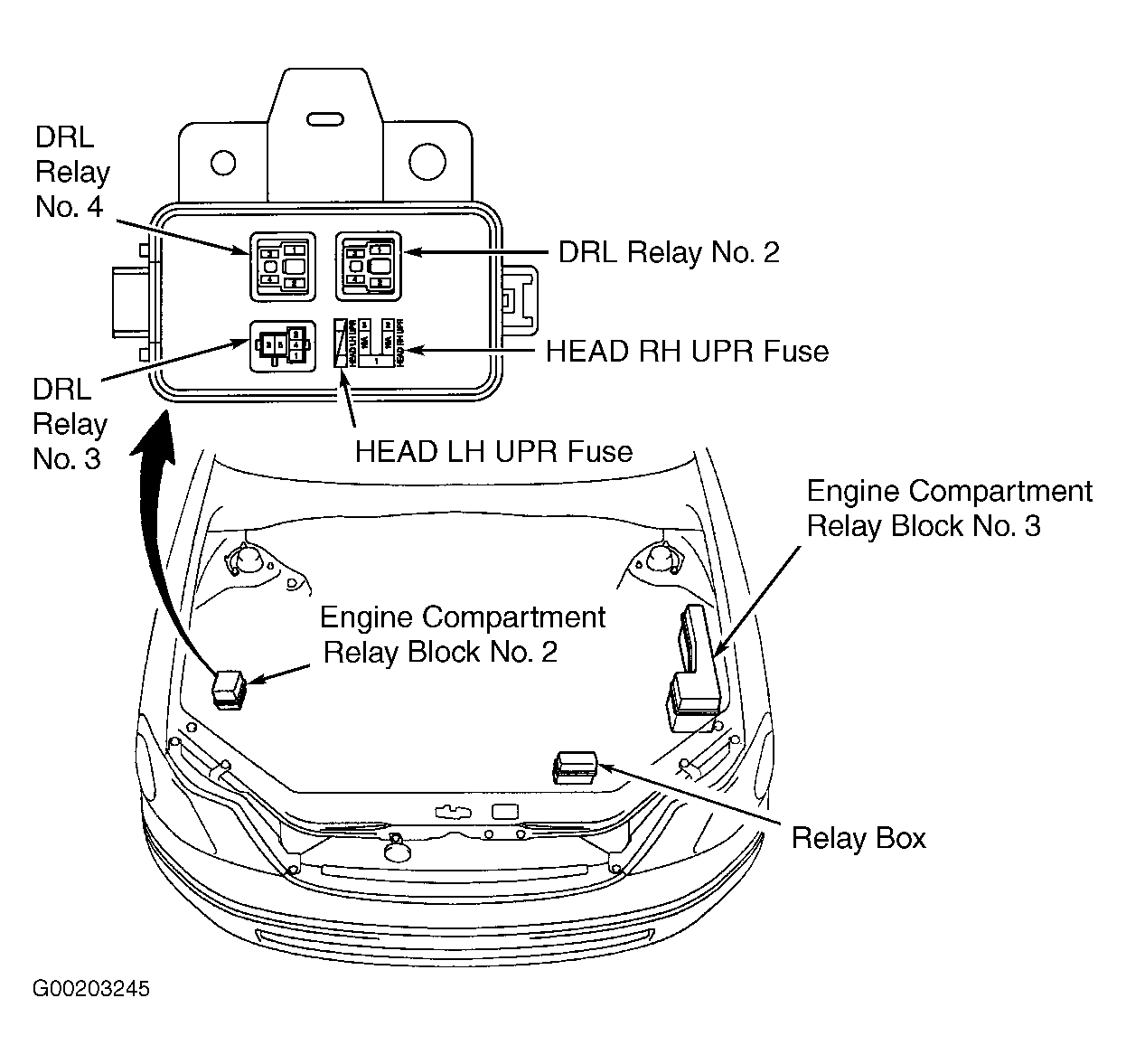 - Turn ignition off. Remove Daytime Running Light (DRL) relay No. 2, 3 or 4. All DRL relays are in engine compartment relay block No. 2 located in front of coolant reservoir and beside windshield washer fluid tank at right front corner of engine compartment. See Fig 1.