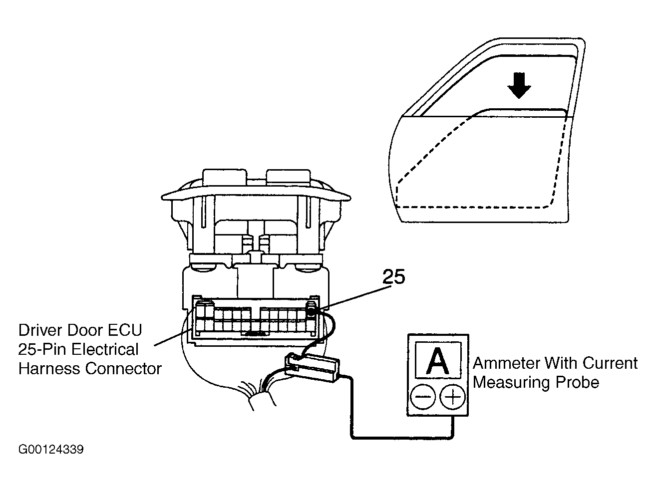 - Backprobing, connect current measuring probe of ammeter to driver door ECU 25-pin electrical harness connector terminal No. 25. Turn ignition on and place driver door power window switch in DOWN position. See Fig 2.