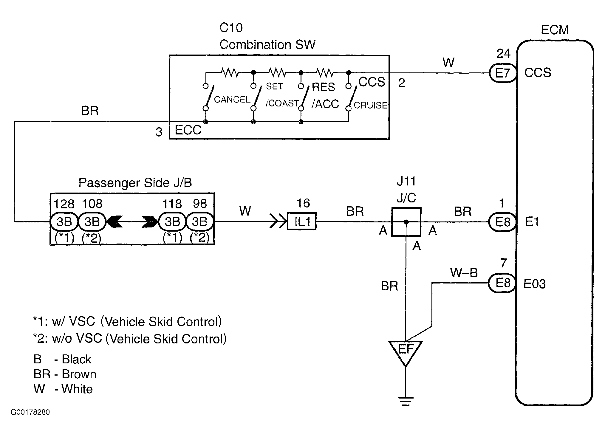 - Check for an open and short circuit in the harness and connector between terminal ECC of the cruise control switch and body ground.
