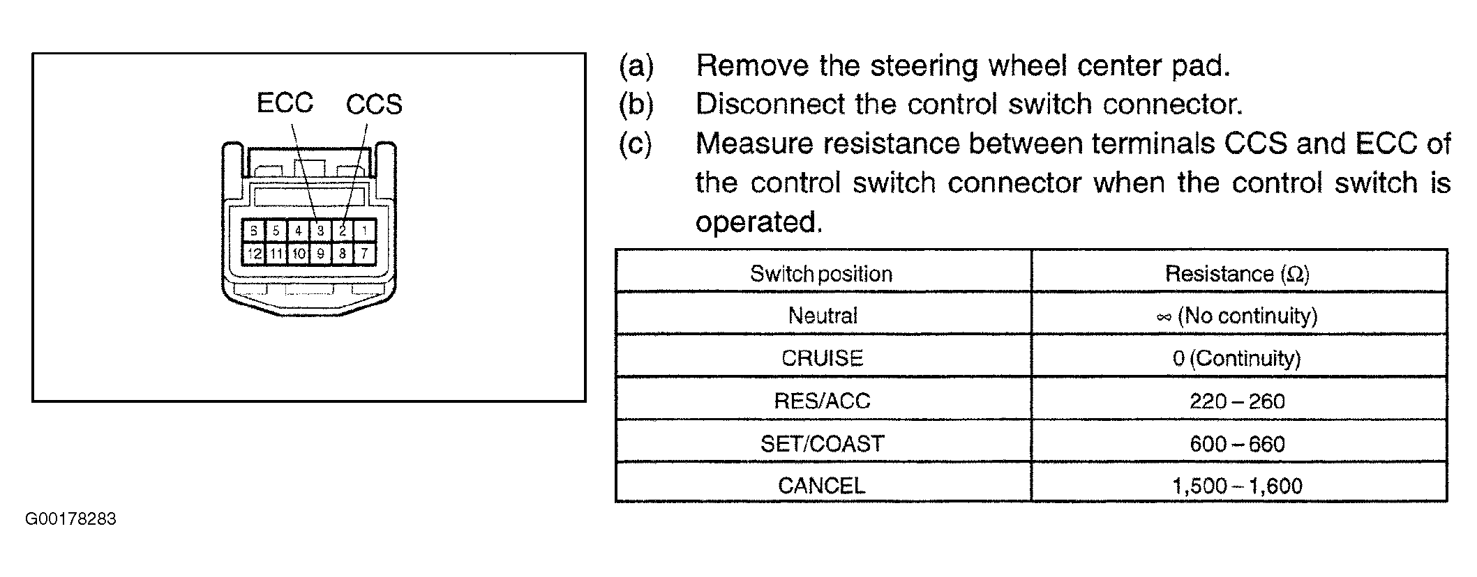 - Check for an open and short circuit in the harness and connector between terminal CCS of the ECM and terminal CCS of the cruise control switch.