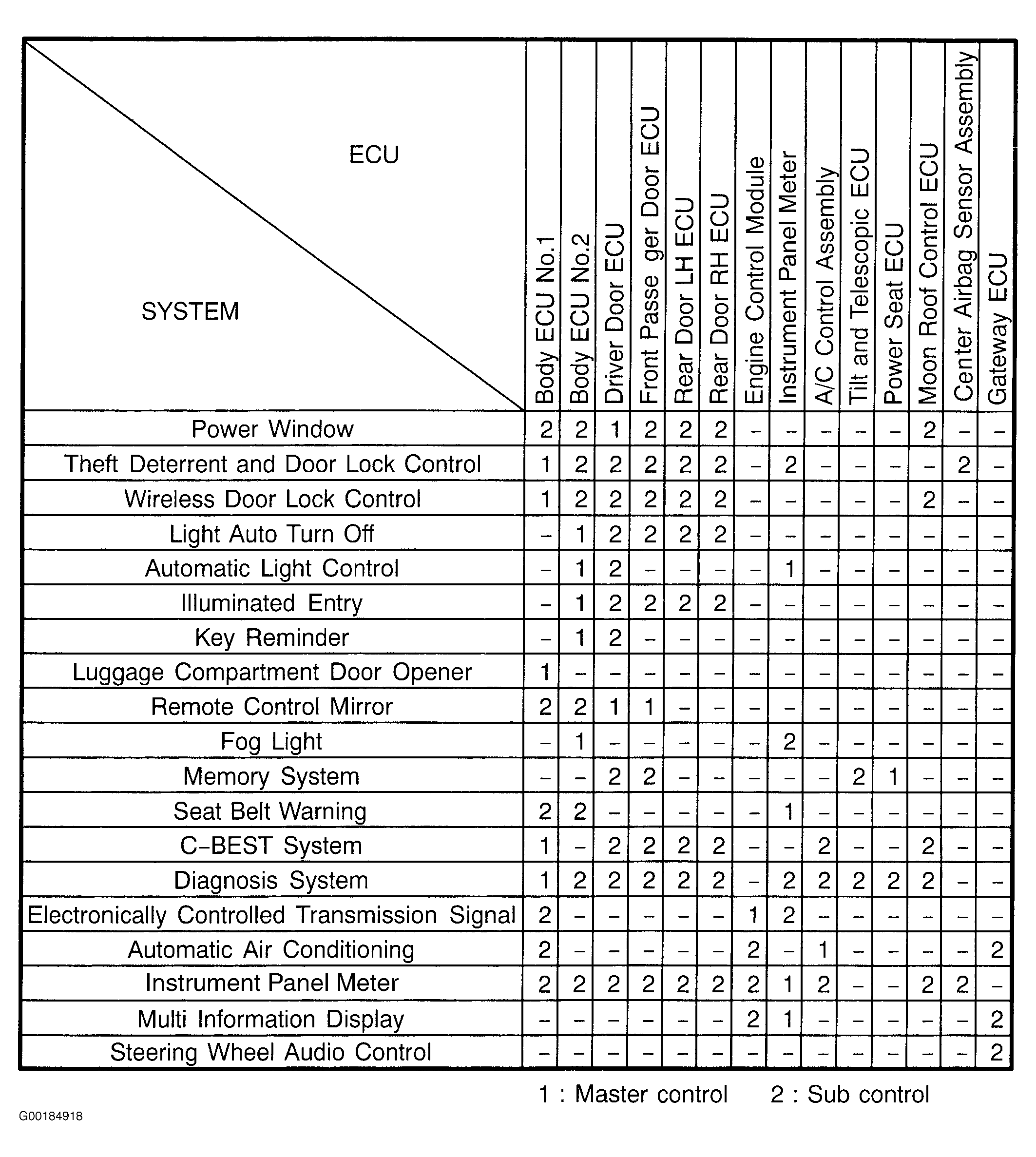 The system is comprised of the communication nodes of the body ECU No. 1, body ECU No. 2, driver door ECU, front passenger door ECU, rear door LH ECU, rear door RH ECU, engine control module, instrument cluster, A/C control assembly, tilt and telescopic ECU, power seat ECU, moon roof control ECU, center air bag sensor assembly and gateway ECU. The body electrical systems are controlled by a serial communication in which each ECU is linked to another via a single communication line. This system is also equipped with a self-diagnosis function. To see the systems under the control of the MPX (multiplex communication system) and related ECUs (communication nodes), see Fig 1.