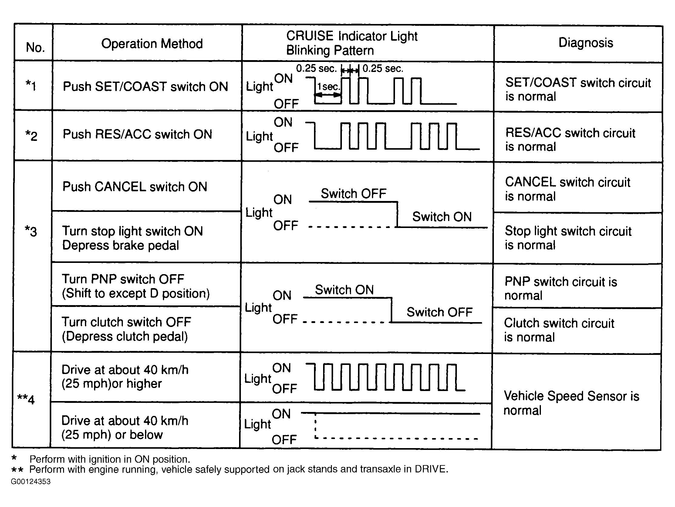- Perform operation method in order given in illustration. See Fig 1. For STEPS 1-3 of Cruise Control Input Signal Check, ignition switch needs to be in ON position. For STEP 4 of Cruise Control Input Signal Check, front of vehicle must be safely supported on jack stands to allow drive wheels to rotate with transaxle in Drive.