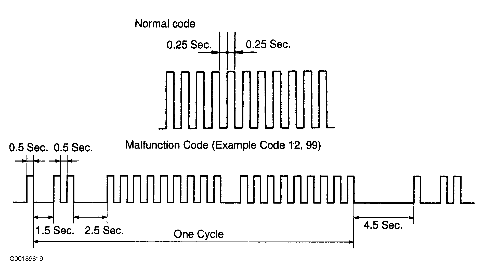 - Read the diagnostic trouble code from the malfunction indicator lamp. If a diagnostic trouble code is not output, check the Tc terminal circuit. See COMPUTER DATA LINES in SYSTEM WIRING DIAGRAMS article. The ECM controls the immobilizer function of this vehicle, DTC is output with engine data. As an example, the blinking patterns for codes; normal, 12 and 99 are shown in charts. See Fig 1.