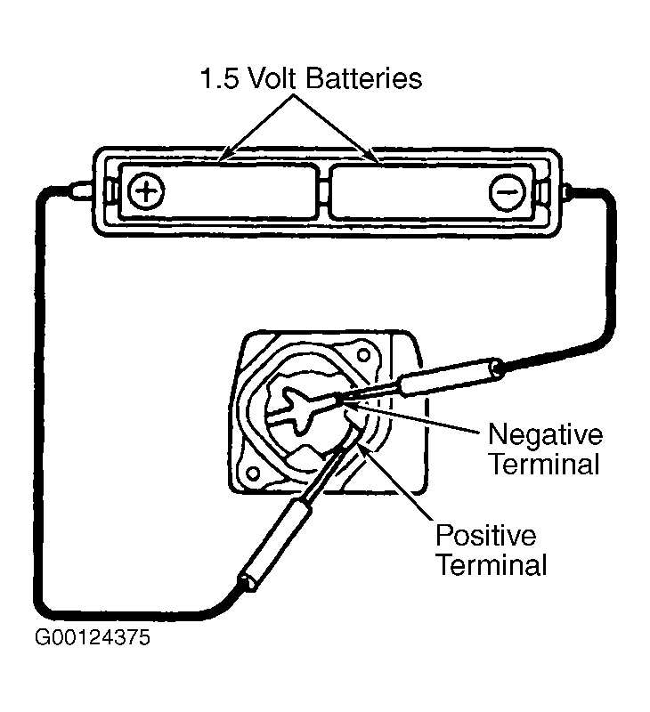1. Remove battery and replace with new battery. See REMOTE TRANSMITTER BATTERY REPLACEMENT  under REMOVAL & INSTALLATION. If new battery is not available, connect 2 new 1.5-volt batteries in series. Using jumper wires, connect positive lead to positive (side) terminal of remote transmitter and connect negative lead to negative (bottom) terminal of remote transmitter. See Fig 1.