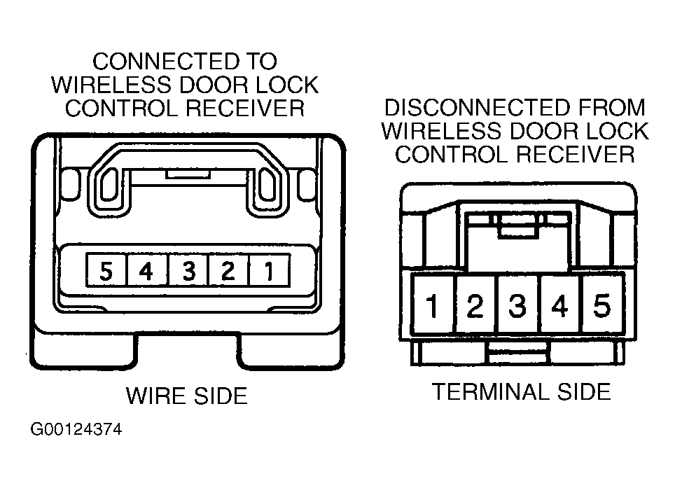 - Remove wireless door lock control receiver. See WIRELESS DOOR LOCK CONTROL RECEIVER under REMOVAL & INSTALLATION. Turn ignition off. Disconnect 5-pin electrical harness connector from wireless door lock control receiver.