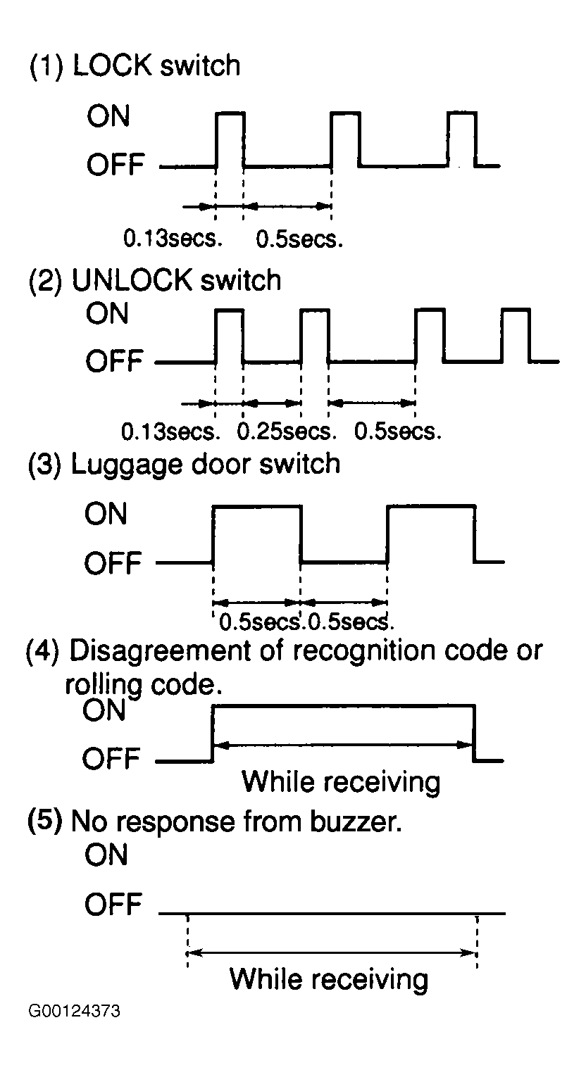 - To exit diagnostic mode, turn ignition switch OFF/ON after checking transmitter button functions. Wireless door lock control system buzzer should sound to signify that diagnostic mode has been terminated.