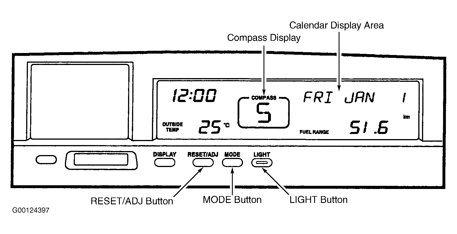 Stop vehicle. Push MODE button several times until ZONE XX appears in calendar display area. See Figure. Push RESET/ADJ button to select the zone where vehicle is located by referring to illustration. See Fig 1. After correct zone is entered, push MODE button several times until calendar display returns to normal.