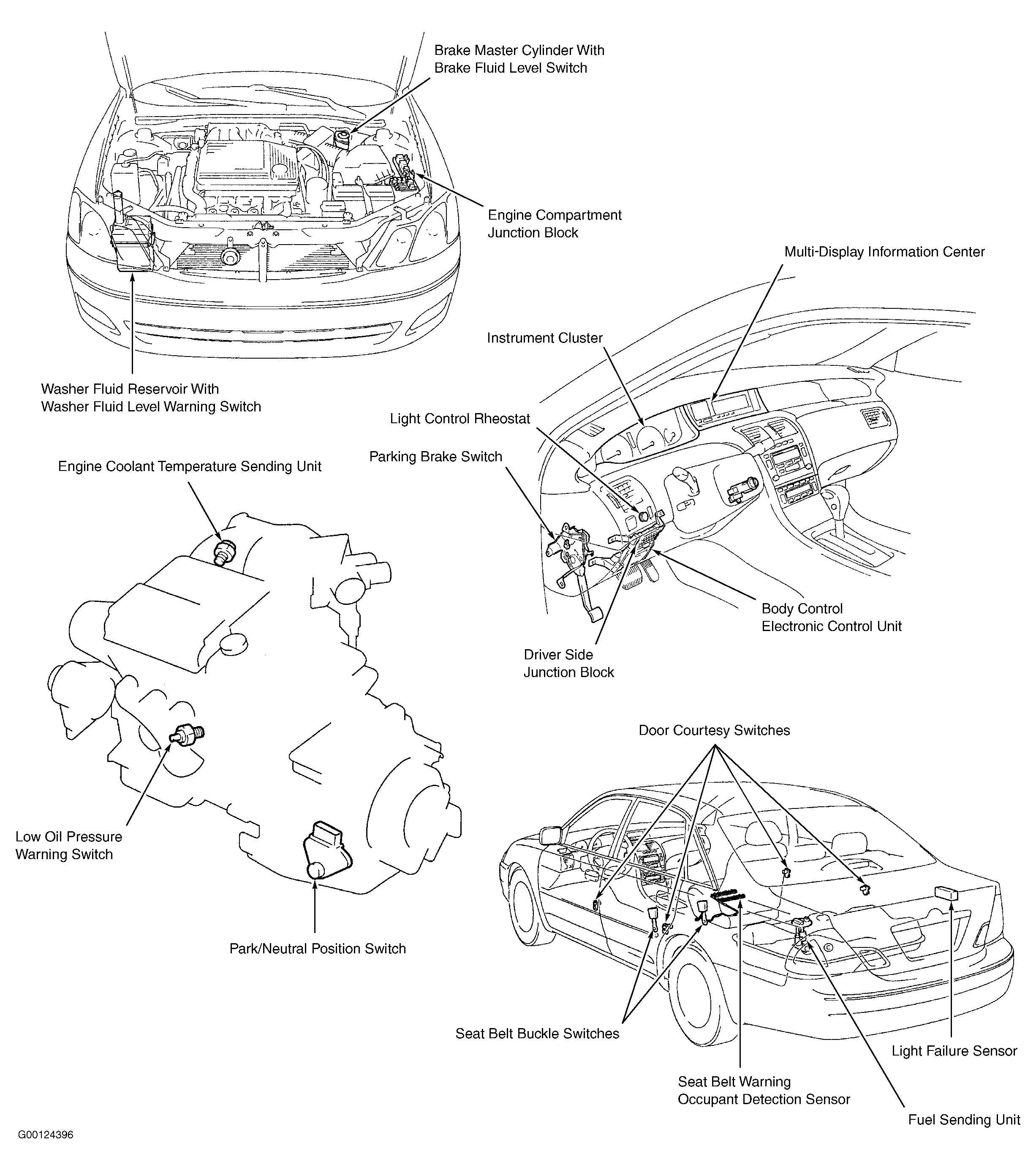 | Brake Fluid Level Switch | On Brake Master Cylinder Reservoir |
