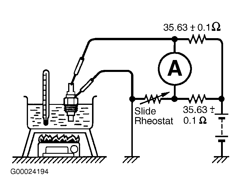 Connect wiring harness as shown in Fig 1. Adjust ammeter pointer to zero using slide rheostat, then read rheostat indicator. Compare resistance value to specifications. See ENGINE COOLANT TEMPERATURE SENDING UNIT RESISTANCE table.