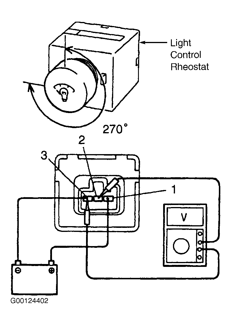 - Turn ignition off. Remove light control rheostat. Light control rheostat is incorporated into heating and ventilation register on left side of instrument panel. Disconnect 3-pin electrical harness connector from rheostat. Using jumper wires, connect positive battery voltage to light control rheostat terminal No. 1 and negative battery voltage to terminal No. 3. See Fig 1.
