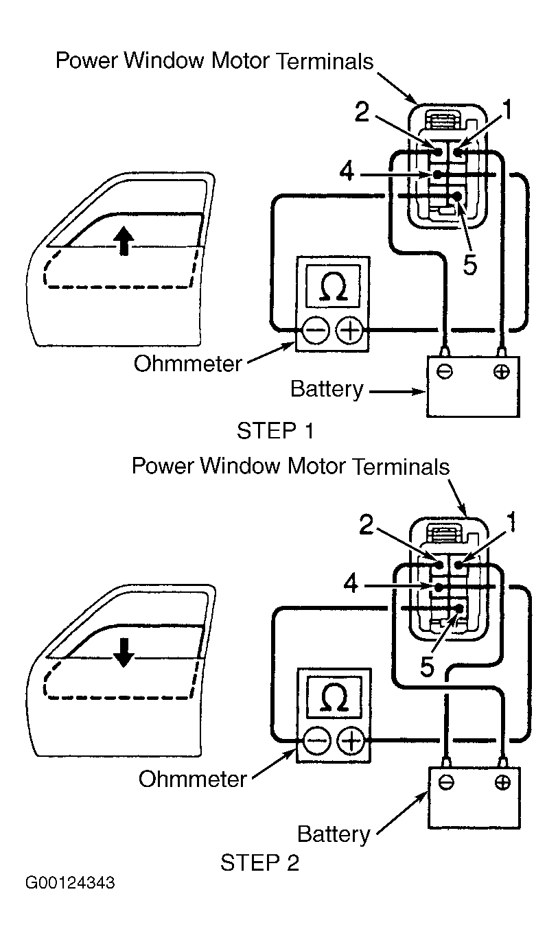 With power window motor 6-pin electrical harness connector disconnected, connect ohmmeter positive lead to terminal No. 4 and ohmmeter negative lead to terminal No. 5 of power window motor. Apply battery positive voltage to terminal No. 2 and battery negative voltage to terminal No. 1 of power window motor. See STEP 2 in illustration. See Fig 1. Ensure continuity exists when window goes down, and does not exist when window is fully opened. If continuity is not as specified, replace power window motor. See POWER WINDOW MOTOR  under REMOVAL & INSTALLATION.