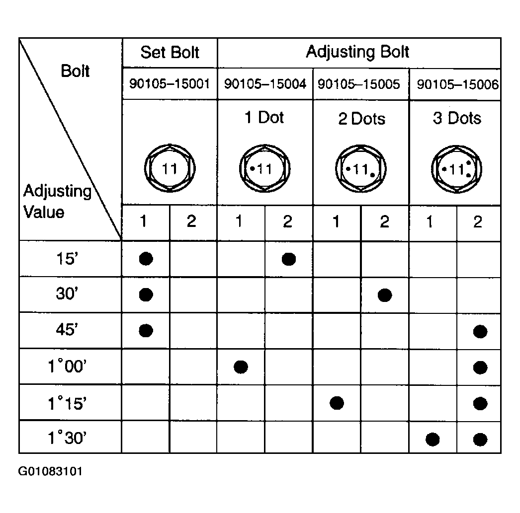 - Adjusting value for the set bolts is 6' - 30' (0.1° - 0.5°). If the camber is not within the specified value, using the table in Fig 9, estimate how much additional camber adjustment will be required, and select the camber adjusting bolt.