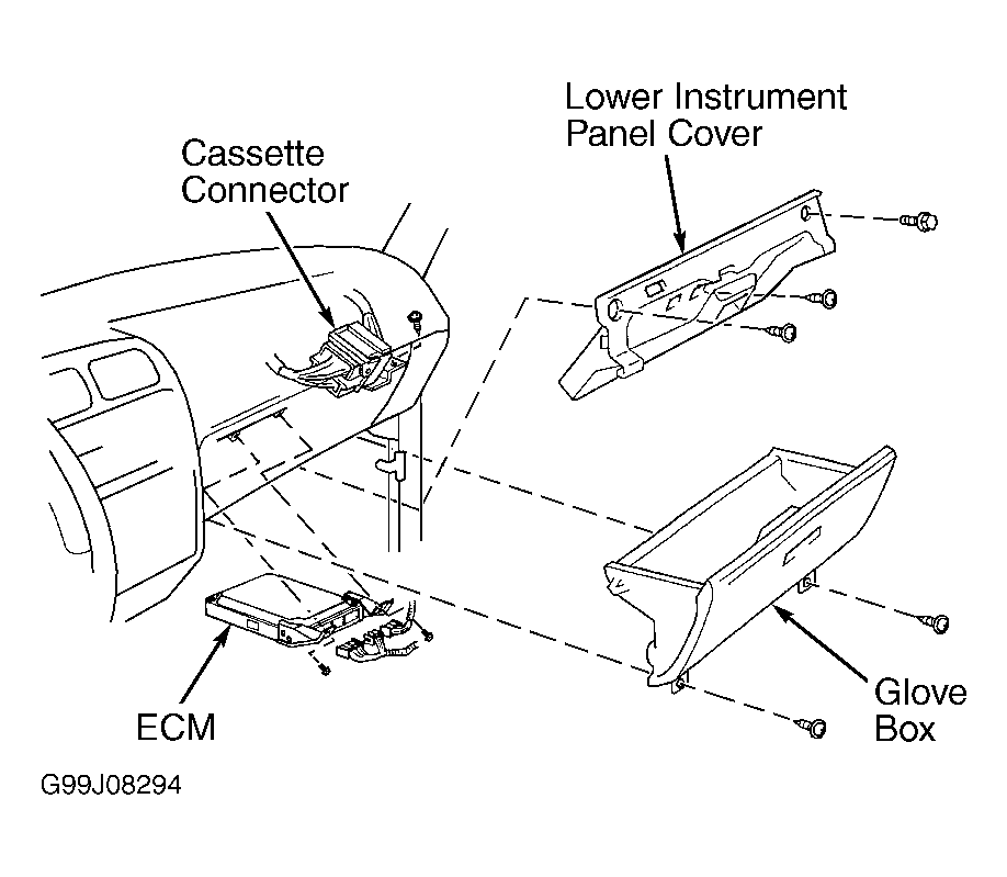 Engine Control Module (ECM) is located behind glove box. See Fig 1.