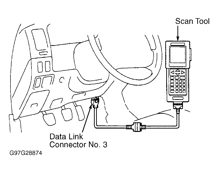 - Connect Toyota hand-held tester or scan tool to Data Link Connector No. 3 (DLC3) at driver's side of instrument panel. See Figure. Turn ignition on with engine off. Turn hand-held tester or scan tool on. Using hand-held tester or scan tool manufacturer's instructions, check for DTCs and freeze frame data.