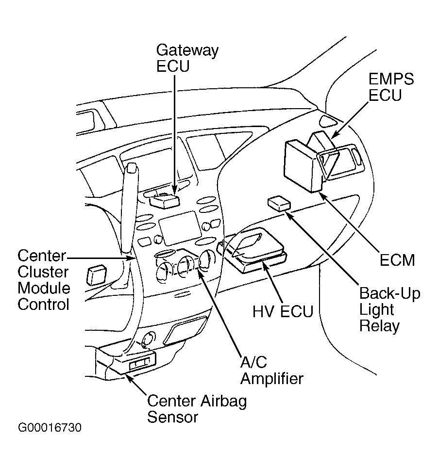 - Check for open and short in wiring harness and electrical connectors between Engine Control Module (ECM) and A/C amplifier. See WIRING DIAGRAMS in appropriate article in AIR CONDITIONING & HEATING. ECM is located behind glove box. See Fig 1. A/C amplifier is attached to rear of center cluster module control. See Fig 1. If wiring harness and electrical connectors are okay, go to next step. If wiring harness or electrical connector is defective, repair as necessary.