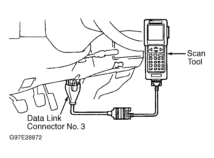 - Connect hand-held tester to data link connector No. 3 at driver's side of instrument panel. See Fig 10. Turn ignition on and then turn hand-held tester on. Read STA signal display on hand-held tester with ignition on, and with ignition switch in START position and engine cranking. STA signal display should read OFF with ignition on, and ON with ignition switch in START position. If STA signal display is not as specified, go to next step. If STA signal display is as specified, diagnose by symptom. See TROUBLE SHOOTING - NO CODES article.
