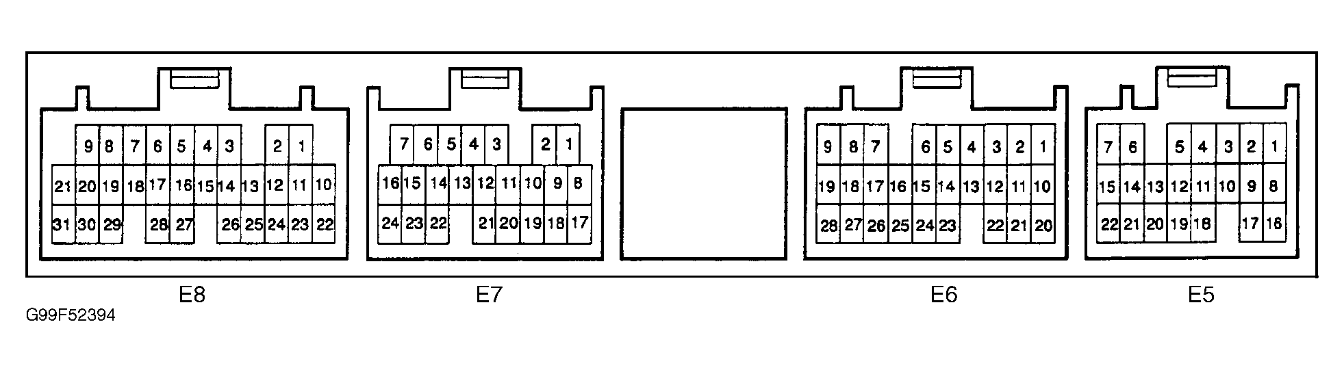 - Check for open in Black/White wire between park/neutral position switch (A/T) or clutch start switch (M/T) and terminal No. 7 at Engine Control Module (ECM) electrical connector E5. This is the starter signal circuit to ECM. See WIRING DIAGRAMS article. ECM is located behind glove box. For illustration of ECM location, see THEORY & OPERATION article. For ECM electrical connector terminal identification, see Figure. Park/neutral position switch is located on side of transmission and clutch start switch is located near top of clutch pedal.