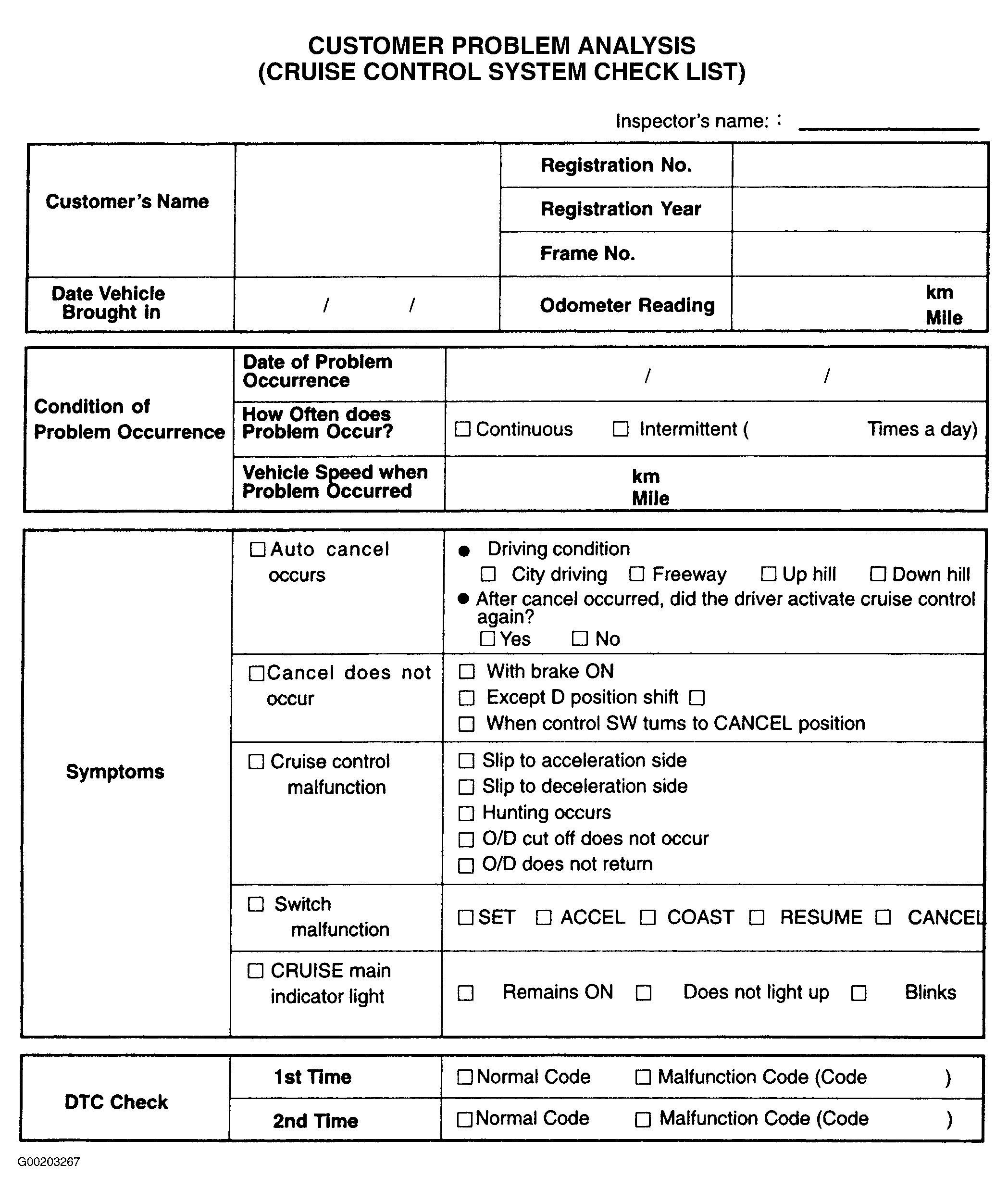 Use the Customer Problem Analysis (Cruise Control System Check List) in conjunction with the trouble shooting flow chart. See Figure and Figure